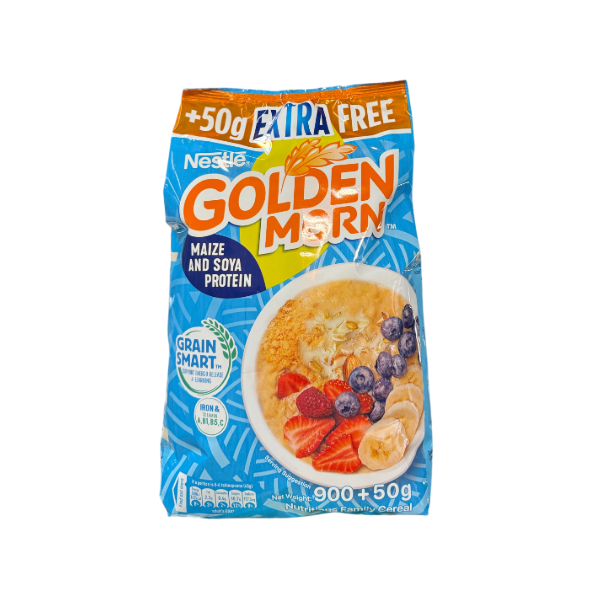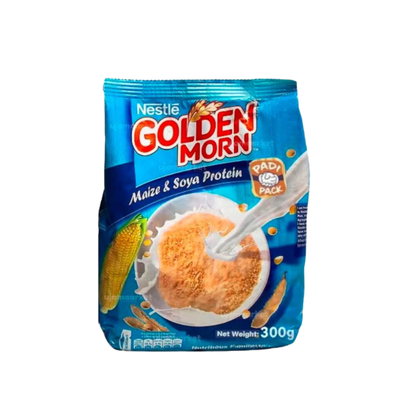 Golden Morn is a nutritious breakfast cereal made from corn and grains. It has a smooth texture and a slightly sweet flavor. Perfect for a quick and healthy start to your day!
